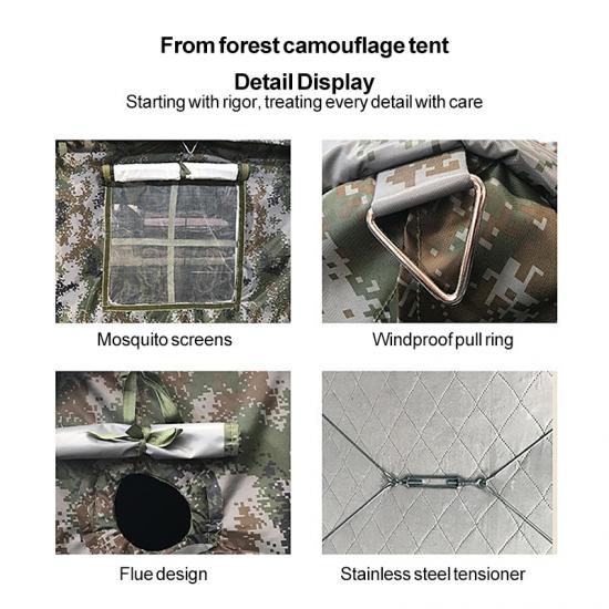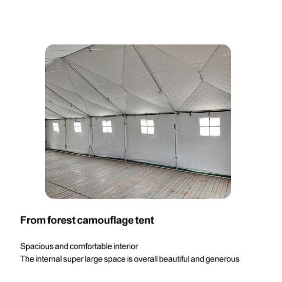 Просторное пространство: Площадь 40 квадратных метров обеспечивает свободное перемещение людей и удобное размещение различного спасательного и жилого оборудования. Камуфляжная палатка площадью 40 квадратных метров повышает комфорт в чрезвычайных ситуациях.