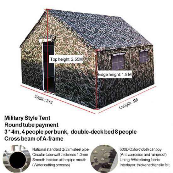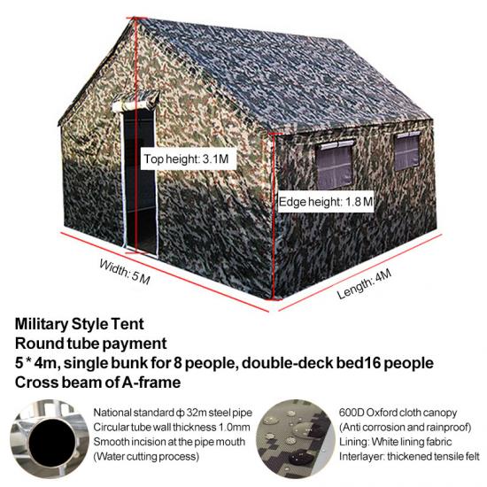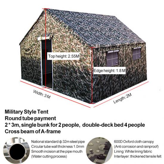 Военное чрезвычайное положение: При выполнении военных задач в чрезвычайных ситуациях, таких как ликвидация последствий стихийных бедствий, палатка служит временным командным пунктом, лагерем и т. д., помогая военным действовать эффективно. Военная камуфляжная палатка для чрезвычайных ситуаций играет ведущую роль.
