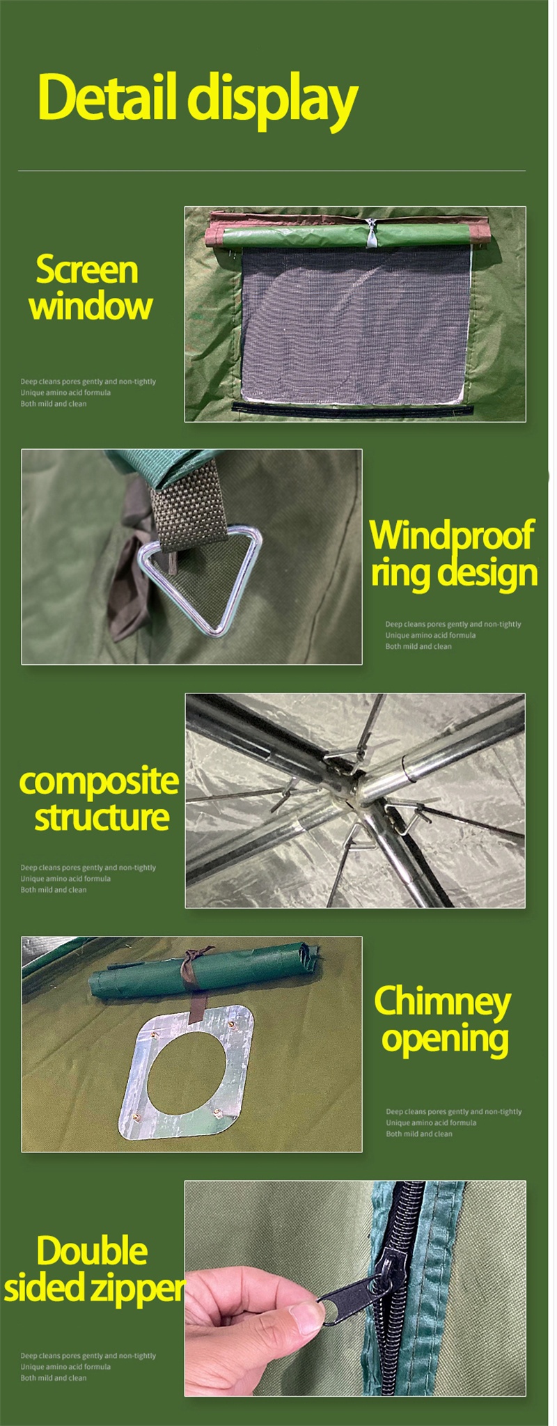 Вы можете наслаждаться пейзажем с комфортом, как днём, так и ночью. Уникальный дизайн наших зимних зелёных брезентовых палаток Вентиляционное отверстие и крышка. Вы можете наслаждаться яркими звёздами или луной в темноте. ночью, днем вы также можете наслаждаться цветами и травой.