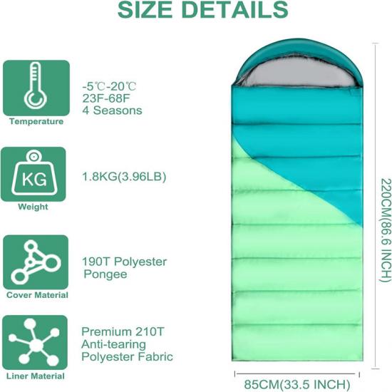 Водонепроницаемый спальный мешок из полиэстера размером 86,6 x 33,5 дюйма/220 x 85 см и весом 1,8 кг/3,96 фунта отличается малым весом и обеспечивает достаточно тепла.