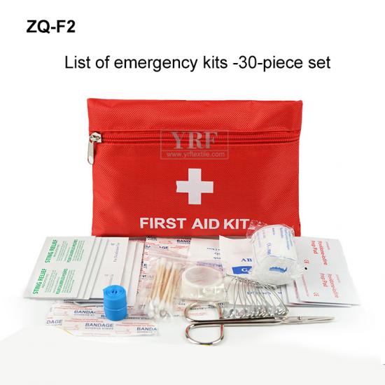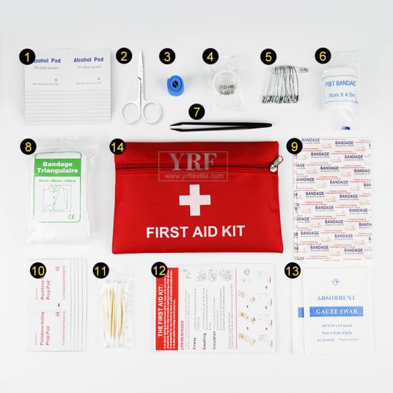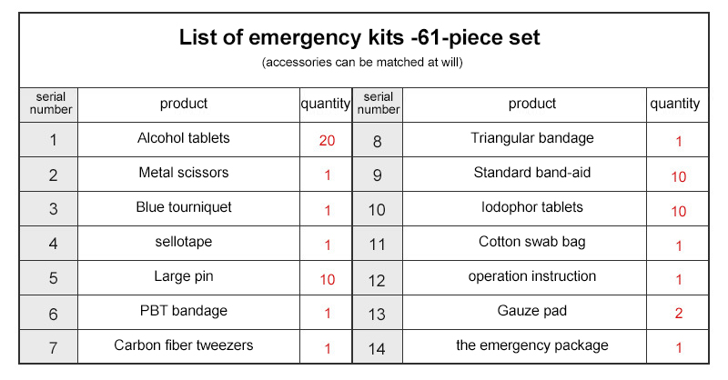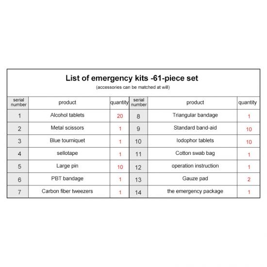 Таблетки спирта *20, Металлические ножницы *1, Синий жгут *1, Лента *1, Большая булавка *10, Бинт PBT *1, пинцет из углеродного волокна *1, треугольный бинт *1, Стандартный пластырь *10, таблетки йодофора *10, ватный тампон *1, Инструкция по применению *1, марлевая подушечка *2, набор для оказания первой помощи *1 |