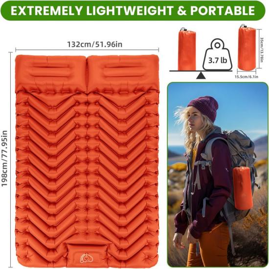 Этот двухместный надувной спальный коврик имеет размеры 78x52x3,5 дюйма / 198x132x9 см и весит всего 3,7 фунта / 1,6 кг.