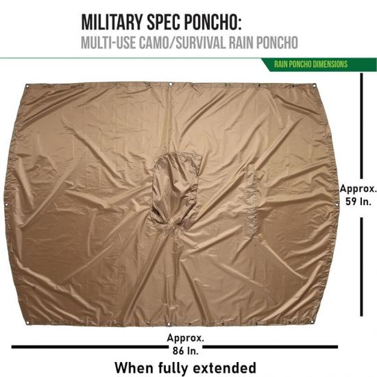Подкладка пончо с водонепроницаемостью 3000 мм изготовлена из полиэстера высокой плотности рипстоп и ткани с полиуретановым покрытием с водонепроницаемостью 3000 мм. Ширина пончо составляет приблизительно 59 дюймов, а общая длина — 86 дюймов. Это достаточно широкое полотно, чтобы вместить более крупные рюкзаки. Размеры сумки для переноски составляют приблизительно 6" x 8" x 3". Общий вес составляет 18 унций, а регулируемый капюшон со шнурком обеспечивает надежную и удобную посадку. Пончо также оснащено регулируемым шнурком с отверстием для капюшона диаметром 9 дюймов, что позволяет пользователю легко регулировать его по мере необходимости.