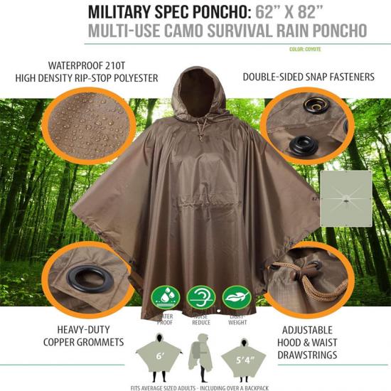 Водонепроницаемая подкладка-пончо обеспечивает сухую защиту от непогоды во время чрезвычайных ситуаций, связанных со стихийными бедствиями, а для тех, кому необходимо выжить в чрезвычайной ситуации, она предоставляет различные способы защиты от внешней среды и обеспечивает комфорт. В армии многоцелевое пончо может использоваться как элемент снаряжения для тайных тактических операций, уменьшая натирание и резкий шум.