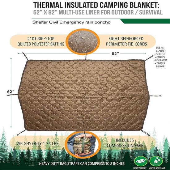ФУНКЦИЯ: Подкладка из полиэстера и хлопка на дождевик-пончо не только обеспечивает тепло и защиту от большинства погодных условий и температуры, но и может использоваться как быстросохнущая временная палатка для выживания, тент, утеплитель для гамака, подушка, разделитель палатки, экран для уединения, средство для переноски в чрезвычайных ситуациях, средство оказания помощи при стихийных бедствиях, скрытое укрытие, сумка для переноски, спальный мешок или утеплитель для палатки.