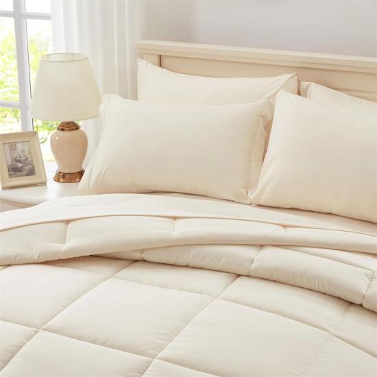A: В комплект Aall Seasons Government Supplies входят одеяло 230 x 260 см, 2 наволочки 50 x 90 см, 1 простыня 270 x 260 см, 1 простыня на резинке 200 x 200 + 35 см и 2 наволочки 50 x 100 см. Эти размеры подходят для широкого спектра кроватей и подушек, создавая аккуратную и гармоничную спальню.