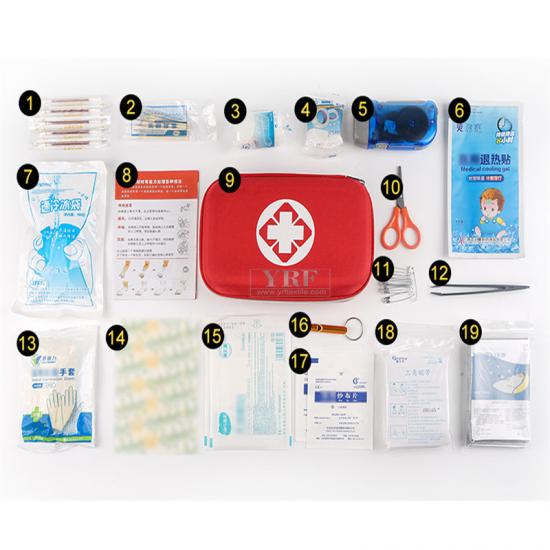 Влажные салфетки * 10 шт./упаковка, Маска * 5, Треугольный бинт * 1, Ватная салфетка с йодофором * 10, Таблетки спирта * 20, Жаропонижающий пластырь * 1, Эластичная тонкая полоска PBT * 1, Маска для сердечно-легочной реанимации * 1, Масло от ветра * 1, Марлевая подушечка * 2, Пластырь * 1, Пластырь * 12, Ватная палочка * 1, Булавка * 10, Пинцет * 1, Жгут * 1, Ножницы * 1, Пакет для экстренного обучения * 1