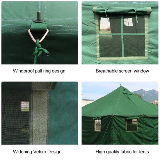 В случае таких стихийных бедствий, как наводнения, лесные пожары или землетрясения, наша аварийная палатка — ваш надежный выбор. Она широко применяется при ликвидации последствий стихийных бедствий, обеспечивая мгновенное укрытие пострадавшим. Военные используют ее для быстрого разбивки лагерей во время операций, а медицинские бригады — в качестве временного медицинского помещения. Она также пользуется популярностью среди пожертвований ООН, в качестве предметов первой необходимости, хранящихся в государственных хранилищах, и в гуманитарных операциях Красного Креста. Изготовленная из высококачественных водонепроницаемых и ветроустойчивых материалов, она выдерживает суровые погодные условия. Доступны различные варианты расцветки в зависимости от требований к видимости. Вместительная внутренняя палатка позволяет хранить большое количество предметов первой необходимости и разместить большое количество людей, что играет важную роль в любой чрезвычайной ситуации.