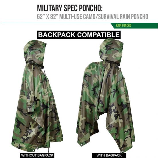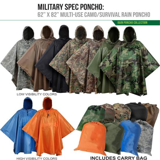 A:Универсальность пончо позволяет адаптировать его к различным сценариям использования, например, в качестве палатки для выживания, скрытого укрытия и т. д.