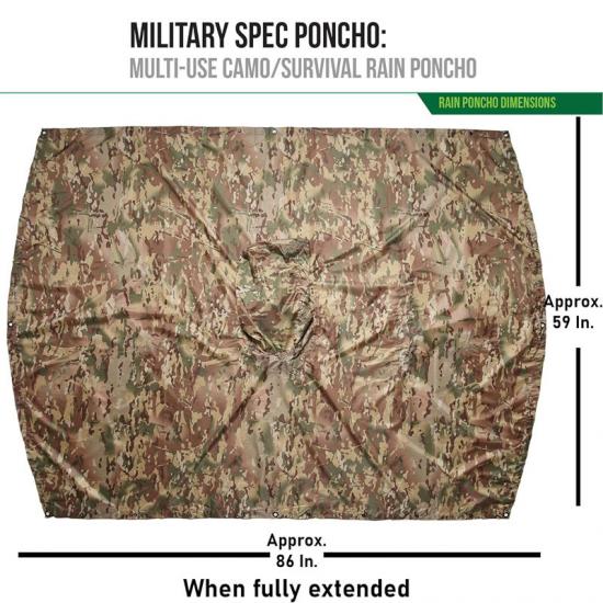 Т Пончо имеет ширину приблизительно 59 дюймов и общую длину 86 дюймов, что достаточно для размещения более крупных рюкзаков. Размеры сумки для переноски составляют приблизительно 6" x 8" x 3". Между тем, вес пончо составляет 18 унций, но оно легкое и удобное для переноски.