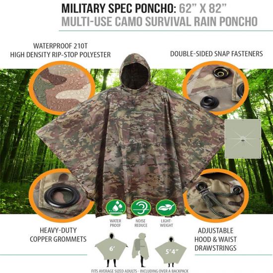 Большие рюкзаки, универсальная подкладка для пончо. Подробно о функциях Помимо основных водонепроницаемых и ветрозащитных функций, палатка-пончо Rain poncho liner имеет ряд дополнительных функций. Дождевик-пончо оснащен завязкой на талии, которая обеспечивает дополнительные 16 дюймов регулировки, позволяя подогнать его под форму тела человека, гарантируя комфорт. Кроме того, в палатке Survival и подкладке дождевого пончо используются восемь прочных металлических люверсов, которые используются для фиксации подкладки пончо, обеспечивая дополнительную изоляцию.