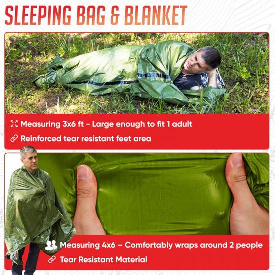 Наш комплект аварийного укрытия изготовлен из прочных и высококачественных материалов с превосходной прочностью и устойчивостью к атмосферным воздействиям. Палатки изготовлены из огнестойких материалов, что гарантирует отсутствие пожара в случае чрезвычайной ситуации. Спальный мешок и одеяло обеспечат комфортные условия для сна. С другой стороны, аварийные пончо обеспечивают дополнительную защиту во время дождя. Все это снаряжение компактно и легко помещается в набор для экстренной эвакуации или в сумку для экстренной эвакуации.
