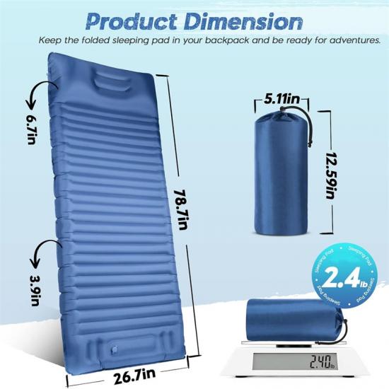 Многофункциональный надувной спальный коврик имеет размеры 78,7x26,7x3,9 дюйма/200x68x10 см в надутом виде.