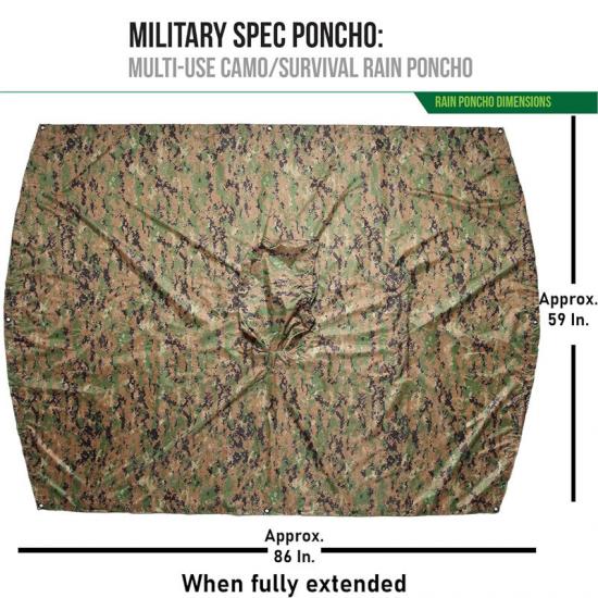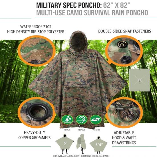 Во-вторых, в военных сценариях использования утеплитель Rain poncho Liner не только обеспечивает защиту от дождя, но и может быть использован в качестве средства маскировки. Высокоплотный армированный полиэстер с полиуретановым покрытием обеспечивает превосходные водонепроницаемые свойства, одновременно снижая натирание и резкий шум. Удобство переноски и регулируемость пончо делают его идеальным вариантом для тактических операций.