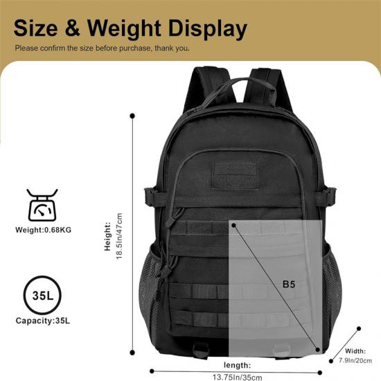 A: Практичный военный рюкзак имеет размеры 18,5x13,7x7,9″/47x35x20 см и имеет объем 35 л, что позволяет