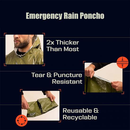 В целом, наш аварийный плащ — это универсальный запас средств для различных чрезвычайных ситуаций и условий на открытом воздухе. Независимо от того, работаете ли вы в чрезвычайных ситуациях, в службе скорой помощи, в армии, обороне, пожарной службе, в службе неотложной медицинской помощи, в медицинском обслуживании или проектировании, наши аварийные пончо обеспечат вам дополнительное тепло и защиту.
