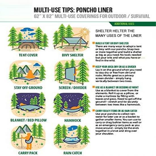 Этот Подкладка из полиэстера для дождевого пончо. Универсальность: Пончо Relief Rescue Poncho Liner оснащено шнурком на талии, который обеспечивает дополнительные 16 дюймов регулировки. Кроме того, в пончо используются 8 прочных металлических люверсов для фиксации подкладки пончо, что обеспечивает дополнительную изоляцию и позволяет легко затягивать шнурок. Это означает, что пончо можно использовать не только как средство защиты от дождя, но и как зонтик, палатку для выживания, средство для сбора воды, переносной рюкзак, носилки для экстренной помощи, чехол для гамака, разделитель палатки, экран для обеспечения конфиденциальности, скрытое укрытие и многое другое. Благодаря своей универсальности многоцелевое пончо может использоваться в самых разных ситуациях.