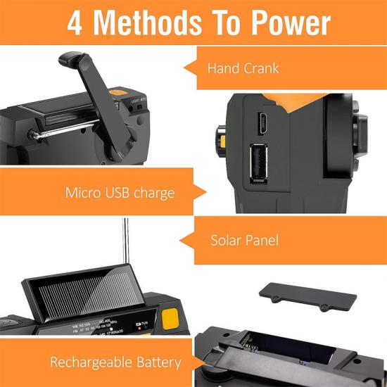 Радиостанция Relief Rescue High quality Radio принимает 7 передач NOAA и имеет доступ к каналам AM FM для профессиональной трансляции последних прогнозов погоды и всех опасностей в вашем регионе, таких как ураганы, лесные пожары, зимние штормы и т. д. Съемный блок питания емкостью 4000 мАч обеспечивает достаточное аварийное питание для нескольких мобильных телефонов, чтобы совершать важные звонки членам семьи или обращаться за помощью в чрезвычайной ситуации.