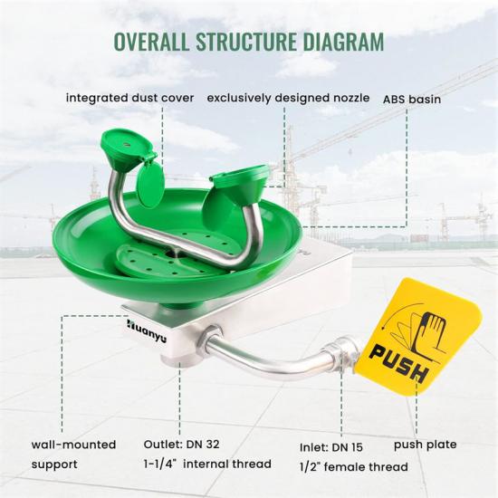 Душ для глаз, разработанный ООН, не только функционален, но и прост в эксплуатации. Входное отверстие имеет внутреннюю резьбу 1/2 дюйма (DN15), а выходное – внутреннюю резьбу 1 дюйм (DN25). Расход воды достигает ≥12 л/мин, а продолжительность работы – более 15 минут. Стоит отметить, что устройство работает без помощи рук: его можно включить одним нажатием, не удерживая кнопку, что эффективно предотвращает повторное попадание воды в глаза и, следовательно, вторичную травму. Кроме того, встроенный пылезащитный колпачок не только защищает сопло от загрязнения, но и поддерживает его в чистоте, предотвращая засорение.