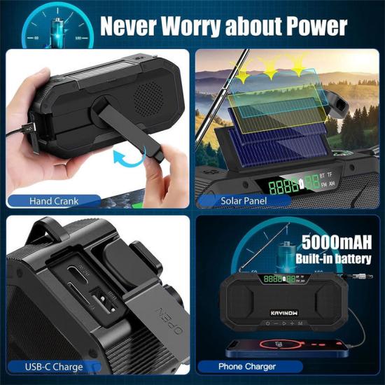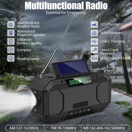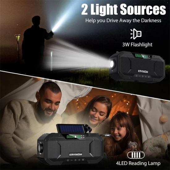 Это недорогое радио подходит не только для повседневного использования дома, но и станет мощным помощником в чрезвычайных ситуациях, связанных со стихийными бедствиями и спасательными операциями. Будь то армия, оборона, пожарная служба, службы скорой медицинской помощи, пожертвования ООН, проектные работы, полиция, государственные запасы и т.д., оно может сыграть важную роль. В случае отключения электроэнергии, шторма или других чрезвычайных ситуаций оно станет для вас важным инструментом получения информации об окружающем мире и обеспечения вашей безопасности. Мощная подсветка и функция оповещения также обеспечат вам безопасность в темноте.