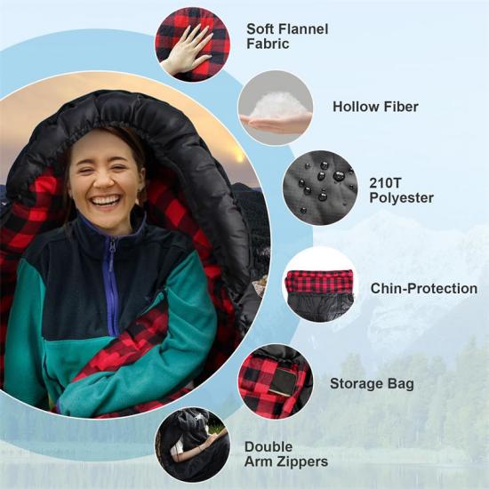 Наш спальный мешок Emergency Relief изготовлен из высококачественного водонепроницаемого полиэстерового материала 210T в клетку, обеспечивающего отличную влагостойкость. Внутренний материал — мягкий и уютный лиф. Наполнитель спального мешка — лёгкий, тёплый и дышащий ажурный хлопок.