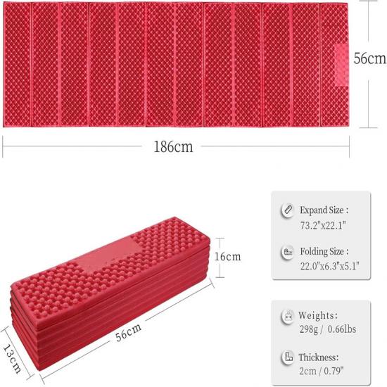 A: Спальный коврик Relief Rescue Foam размером 73,2x22x0,59 дюйма (186x56x1,5 см), удобен для переноски.