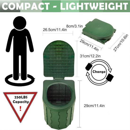 Этот лёгкий туалет со сменными мешками — это больше, чем просто туалет. Его можно использовать как многофункциональное устройство для хранения вещей, мусорное ведро, небольшой табурет, контейнер для хранения и многое другое. Благодаря прочной конструкции он очень устойчив, даже если на нём сидит человек весом менее 90 кг. Когда вам нужно сделать перерыв или оставить вещи, он вам поможет.