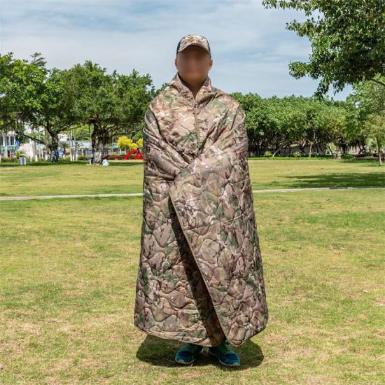 Это камуфляжное теплое одеяло-пончо изготовлено из прочного материала 210T с напыленным хлопковым наполнителем, имеет размеры приблизительно 55x78,7 дюймов в развернутом виде в подкладке для аварийного пончо и весит 1,63 фунта. Одеяло можно полностью сжать в компрессионный мешок для удобства переноски и хранения, что позволяет сэкономить место и объем. Это многофункциональная подстежка-пончо с высокой степенью практичности.